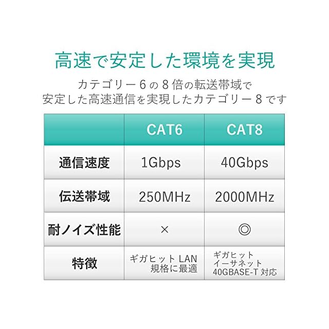 Cat6の8倍である2000MHzまでの高周波帯域まで対応しており、ノイズ干渉にも強く、高速で安定したネットワーク環境を実現します。