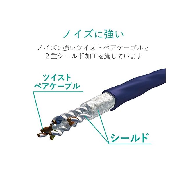 ギガビット以上の高速通信で起こりがちな、隣り合ったケーブル間でのノイズ干渉による通信エラー(エイリアンクロストーク)を防ぐ二重シールド構造を採用しています。