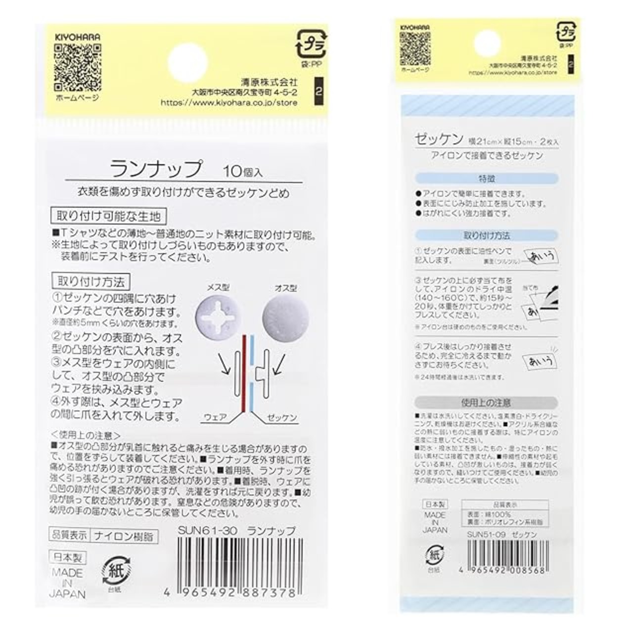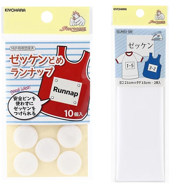 衣類を傷めずに取り付け出来るゼッケンどめ・アイロンで接着できるゼッケンのセットです。 まとめて買うことができるお得なセットです。