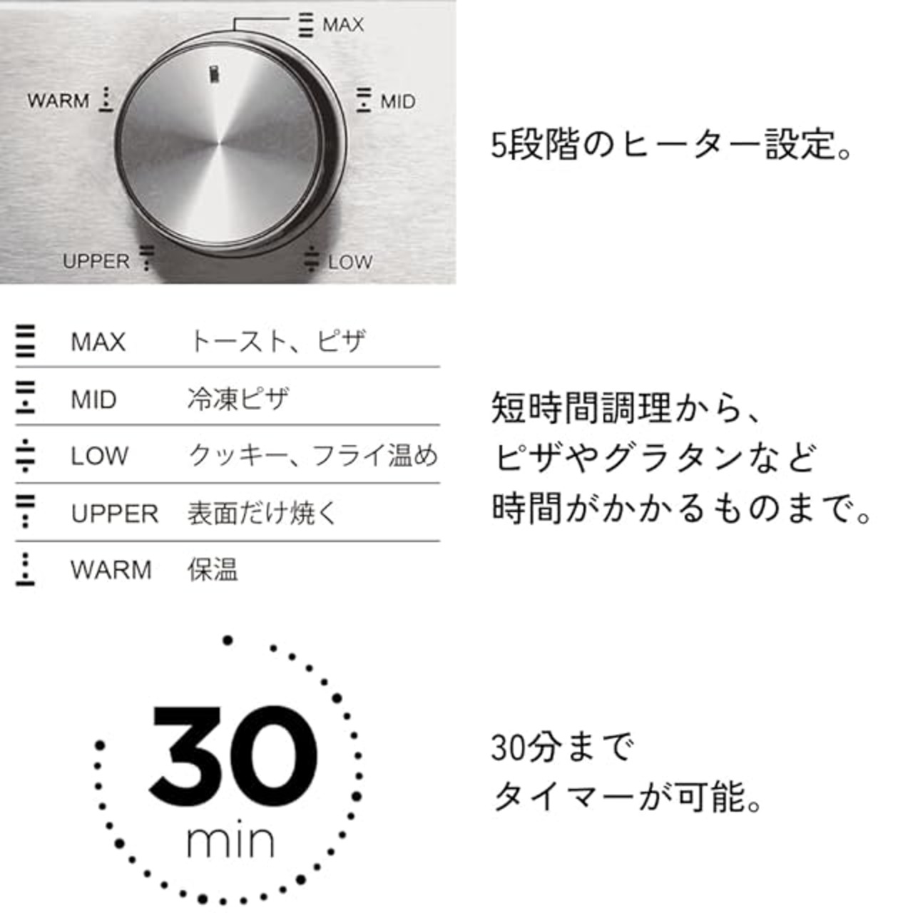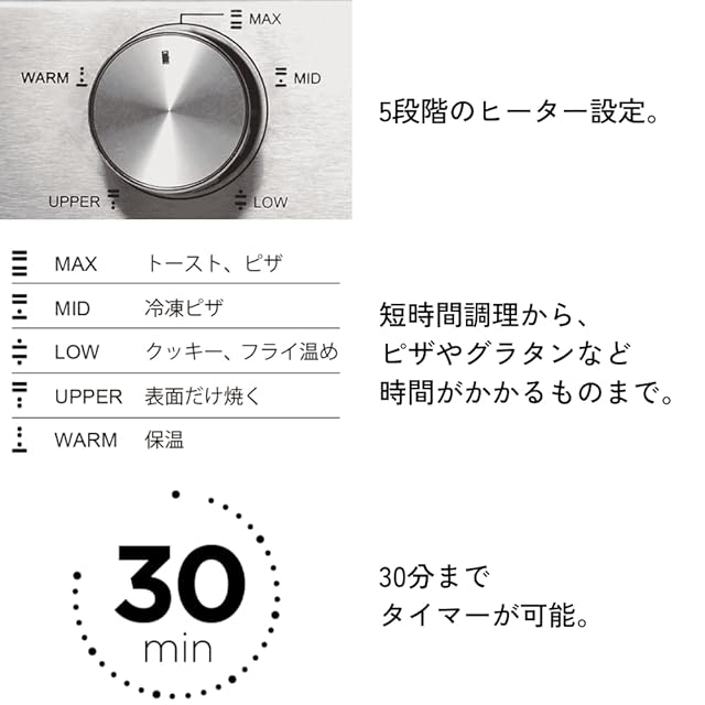 30分までタイマーを設定できるため、ピザやグラタンなどもじっくり調理することができます。一般的なトースターよりもタイマーとヒーターの調節が細かく設定できるため、見た目にもおいしく焼き上がります。
