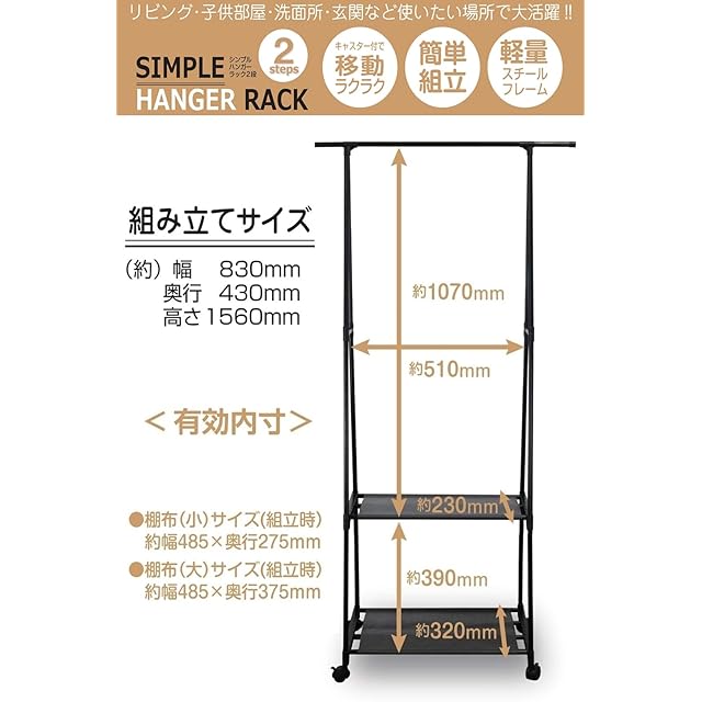 商品名:トレードワン(TRADE ONE) ハンガーラック 2段 幅83×奥行83×高さ156cm 耐荷重10kg 棚板付き 組立簡単 軽量 大容量 ブラック 30693
