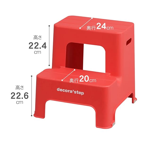 商品名:サンカ デコラステップ 踏み台 昇降ステップ台 レッド 2段 広い足のせ部分と滑り止め加工 インテリアになじむおしゃれでかわいい丸いフォルム 耐荷重100kg 軽量設計 日本製 子供 トイレ 玄関 洗面所 洗車台 足台 キッズ 室内 (幅43.5×奥行48.3×高さ45cm) DS2-RE
