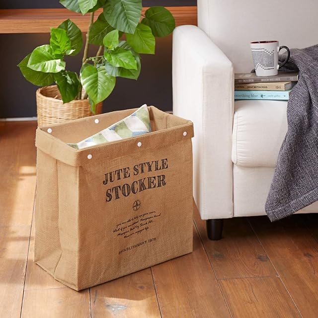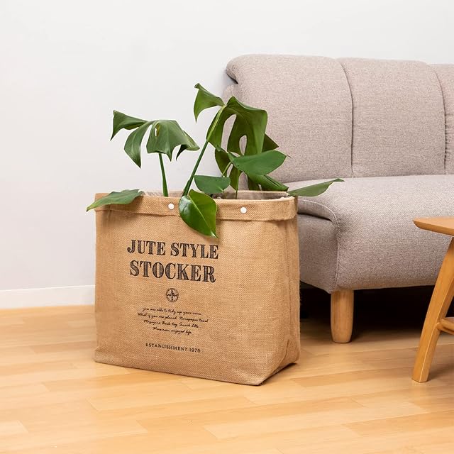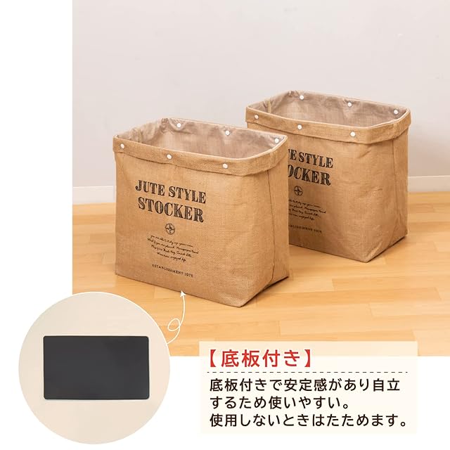 【商品仕様】:本体サイズ/約幅40×奥行26×高さ40cm、カラー/ブラウン系(麻素材)、材質/本体:麻(ジュート、ポリエチレンコーティング)・底板:ポリプロピレン
