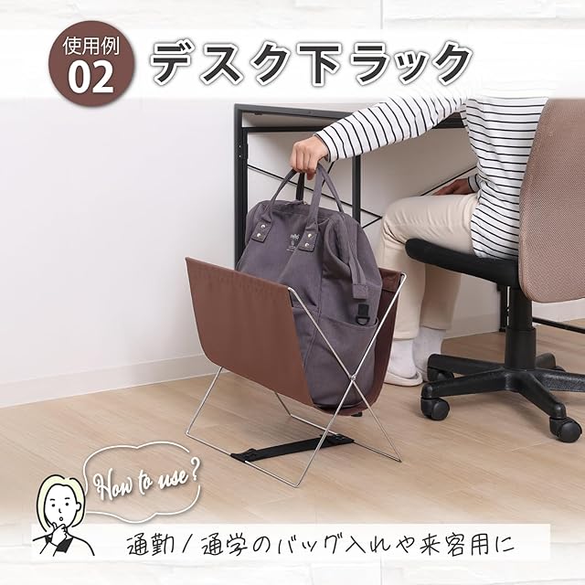【さまざまな場所やシーンで使えて役立つ】:自宅だけでなく、オフィス、シェアオフィス、お店、カフェ、飲食店などでの手荷物入れとしても。