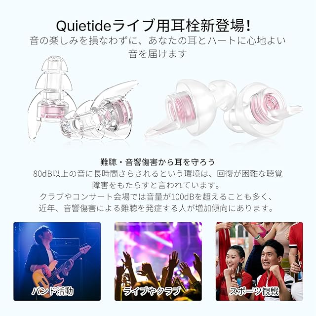 ライブ用耳栓 Quietide 耳栓 ライブ イヤープロテクター 聴覚障害予防 コンサートやフェス、クラブなどで大音量の音楽を楽しむ方向け 水洗い可能 繰り返し使用可能 携帯ケース付き 日本語説明書付 Q6 ピンク&ピンク