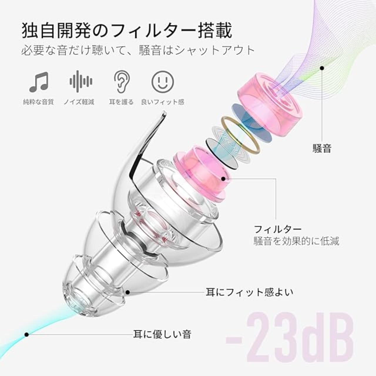 ★【2種類の耳栓 快適なつけ心地】2種類の耳栓を入れ、自分の耳に合う耳栓を選んでご利用いただけます。また、色の異なる2ペアのフィルターをご用意、自分の好みに合わせて自由に組み合わせられます。耳栓は、人間工学に基づいた画期的なデザイン、ユニークな形で耳穴に吸い付くようなフィット感があり、快適なつけ心地です。また、シリコン素材を採用され、柔軟性抜群で、長時間装着しても耳が痛くなりません。中空設計で、良好な通気性も発揮して、装着時の不快感や、耳に水が入ったような閉塞感はありません。