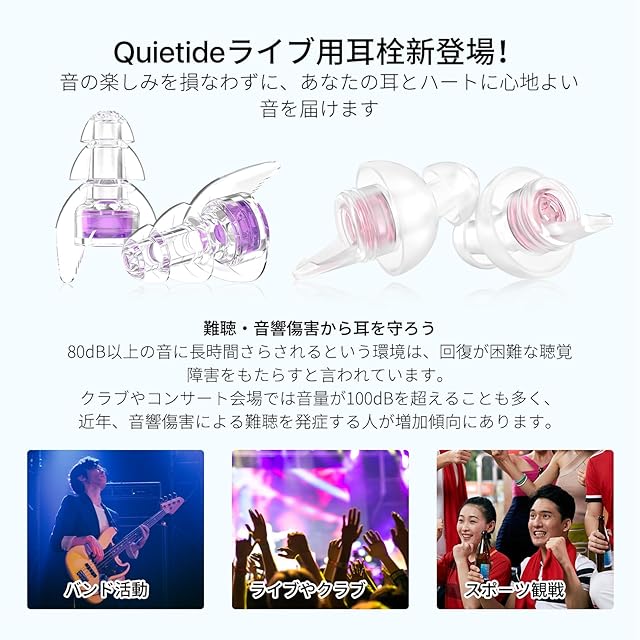 商品名:ライブ用耳栓 Quietide 耳栓 ライブ イヤープロテクター 聴覚障害予防 コンサートやフェス、クラブなどで大音量の音楽を楽しむ方向け 水洗い可能 繰り返し使用可能 携帯ケース付き 日本語説明書付 Q6 ピンクと紫 カップルお揃い 親子お揃い