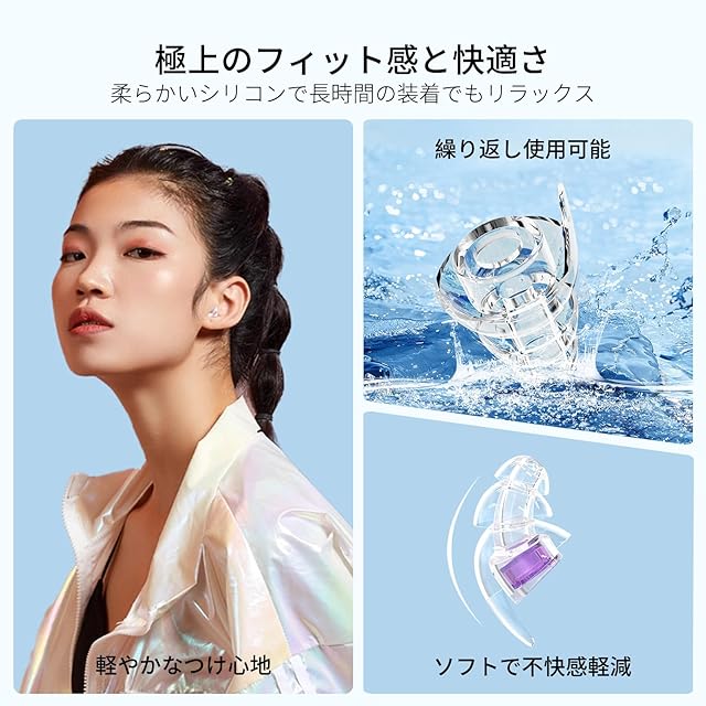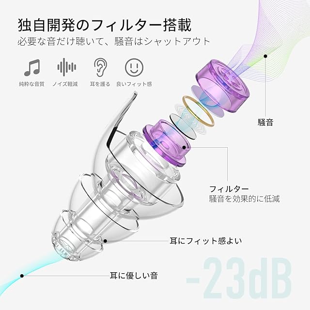 ★【2種類の耳栓 快適なつけ心地】2種類の耳栓を入れ、自分の耳に合う耳栓を選んでご利用いただけます。また、色の異なる2ペアのフィルターをご用意、自分の好みに合わせて自由に組み合わせられます。耳栓は、人間工学に基づいた画期的なデザイン、ユニークな形で耳穴に吸い付くようなフィット感があり、快適なつけ心地です。また、シリコン素材を採用され、柔軟性抜群で、長時間装着しても耳が痛くなりません。中空設計で、良好な通気性も発揮して、装着時の不快感や、耳に水が入ったような閉塞感はありません。