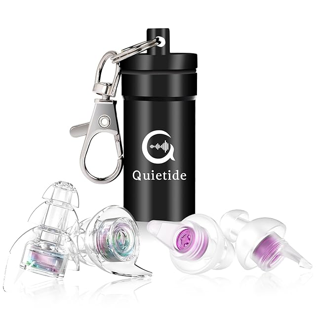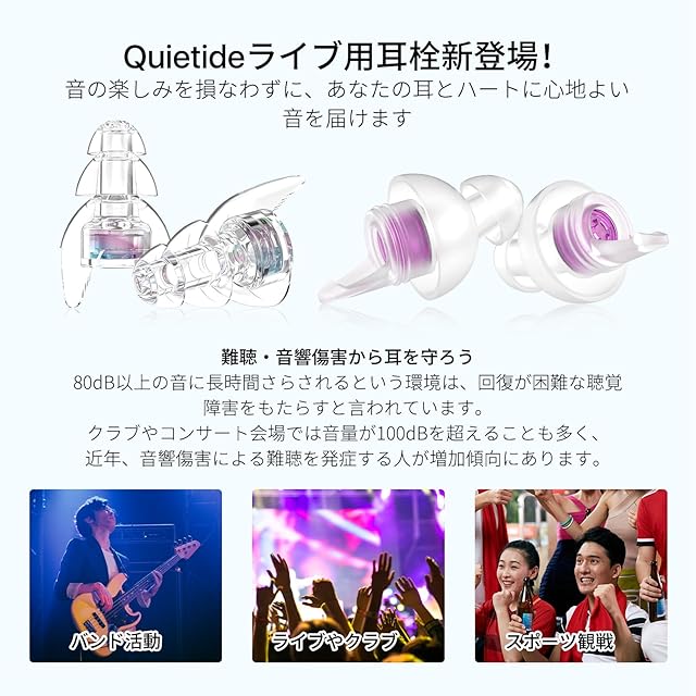 ライブ用耳栓 Quietide 耳栓 ライブ イヤープロテクター 聴覚障害予防 コンサートやフェス、クラブなどで大音量の音楽を楽しむ方向け 水洗い可能 繰り返し使用可能 携帯ケース付き 日本語説明書付 Q6 紫と多彩