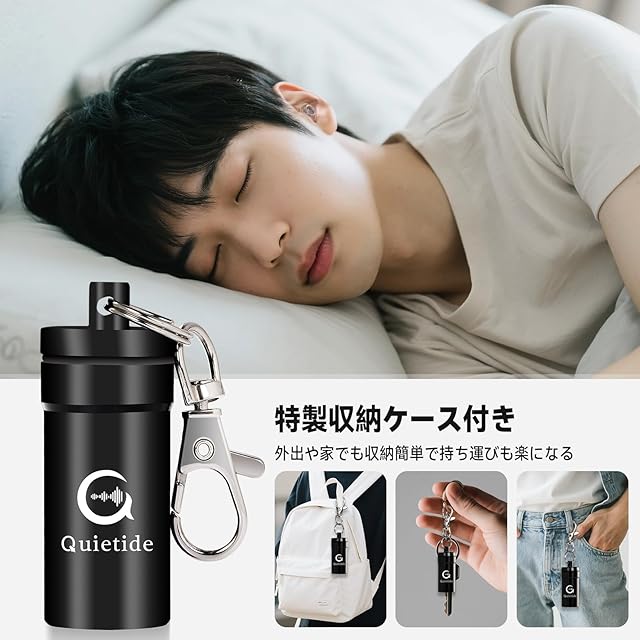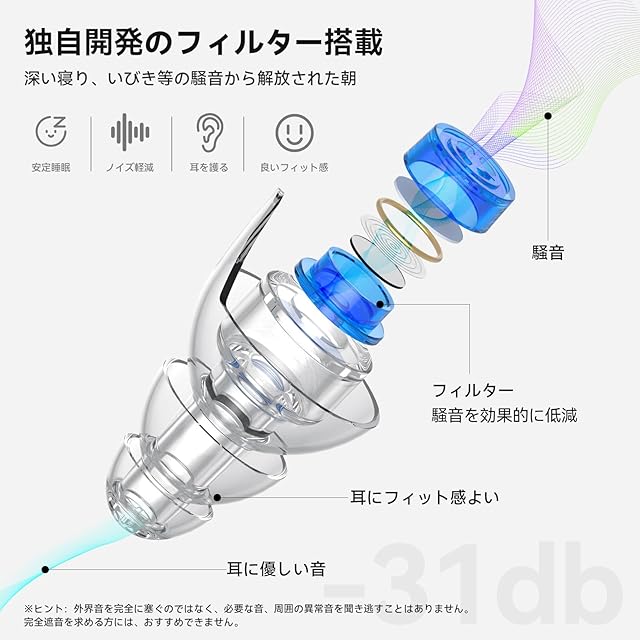 【独自開発のフィルター耳栓で騒音から耳を守る】--イヤープロテクターの質を決定づける構成要素は二つあります。一つは使用されている耳栓の形状や材質、もう一つは耳栓に装着されるフィルターです。Quietideイヤープロテクターは、独自開発のSNR31dBフィルターを搭載し、周囲の騒音を効果的に低減し、睡眠に適した環境を作ることができます。これまでの製品よりも耳栓の遮音性能を向上させ、日常の騒音を心地よい静寂に変えてくれます。周りの環境音を全体的に下げて、聴覚にダメージを与えないレベルまで安全に音量を低減してくれる聴覚障害予防グッズです。※外部音を完全に遮断するのではなく、約31dBまで減衰させることができ、重要なアラームや警報、周囲の異常音など必要な音を聞き逃すことはありません。災害時や緊急時にも安心して休むことができます。