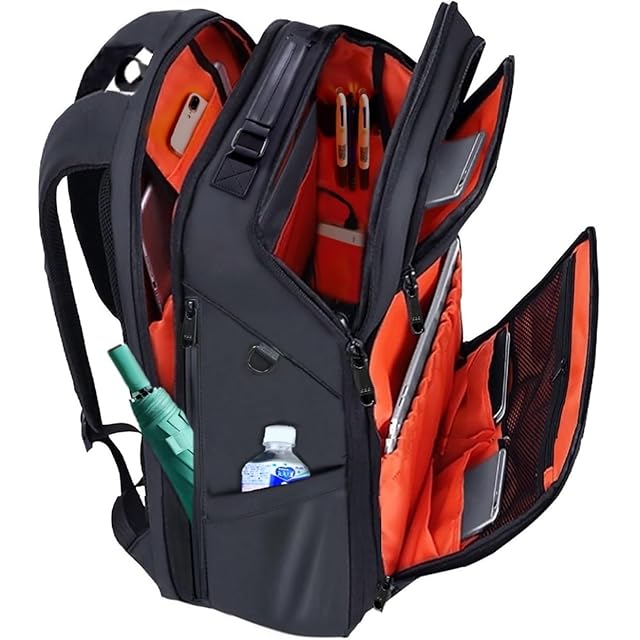 [ABIBA] 【ファスナー徹底 リュック メンズ ビジネス リュックサック スクエア 大容量 旅行用 PC 通学 通勤 出張 USB充電ポート 黒 型崩れ防止 しない (ブラック(裏地:オレンジ))