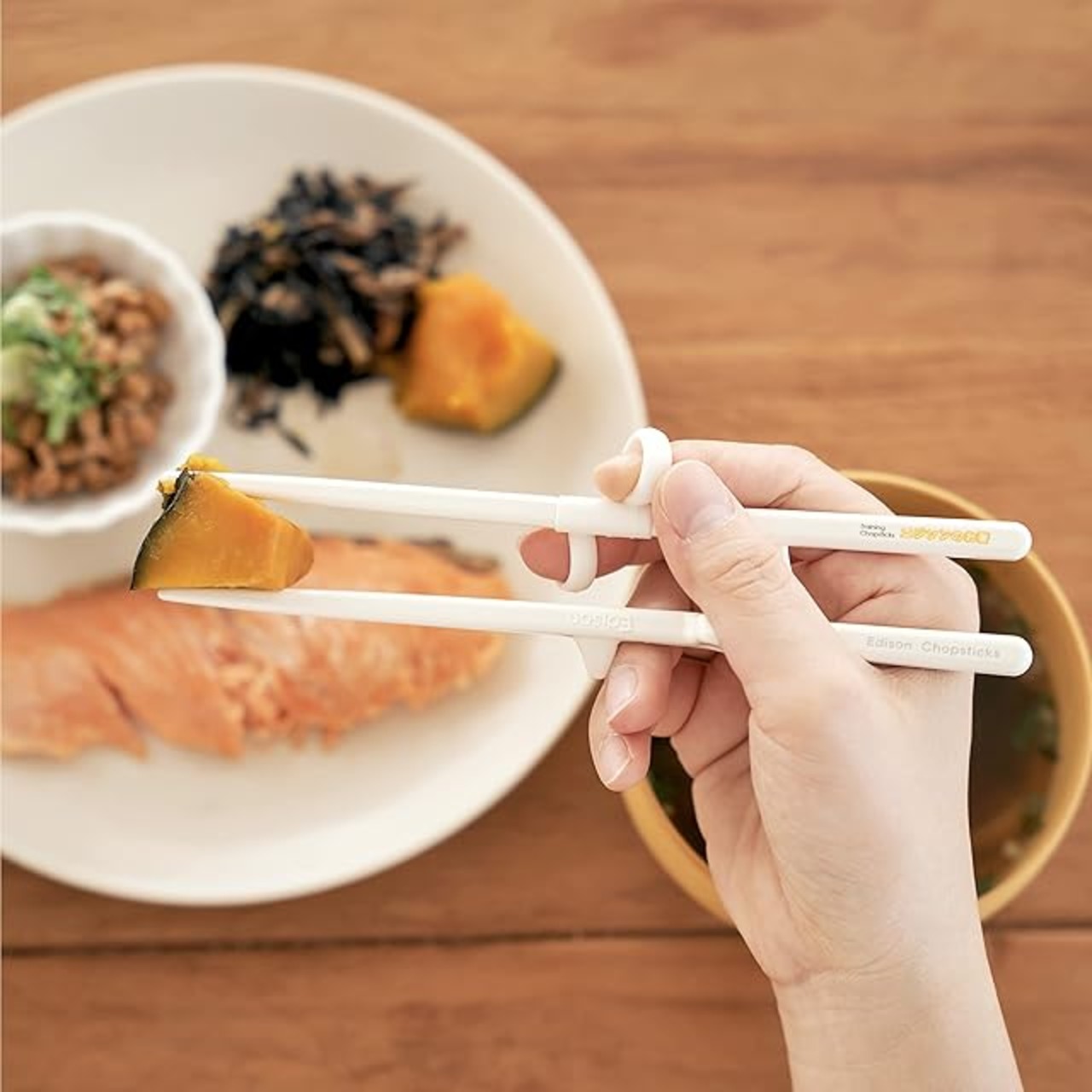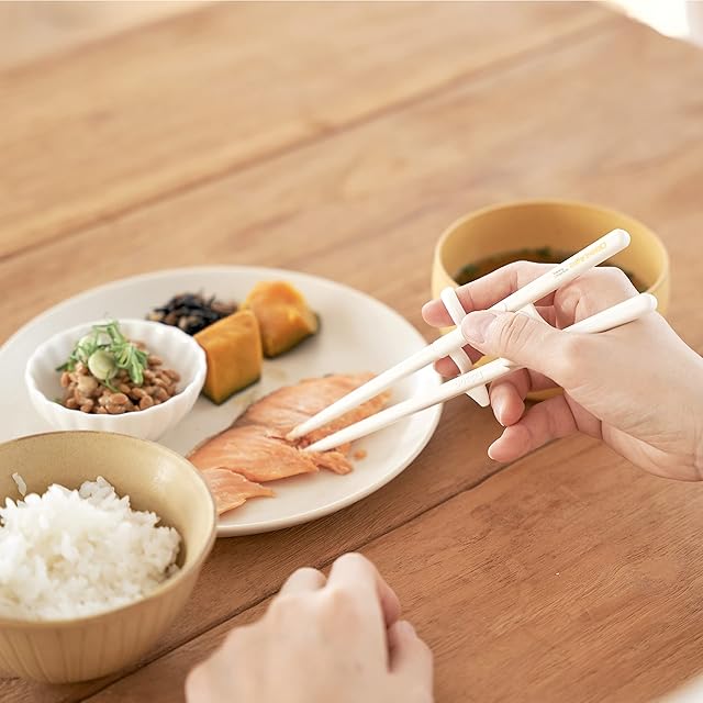 リングに指を入れるだけで、すぐに正しくお箸を使えます。連結部でお箸の交差を防止し、箸先は掴みやすいよう、幅広い形状ですべり止め加工されています。親指と人指し指を直角に広げた長さの1.5倍がちょうどいい箸の長さです。