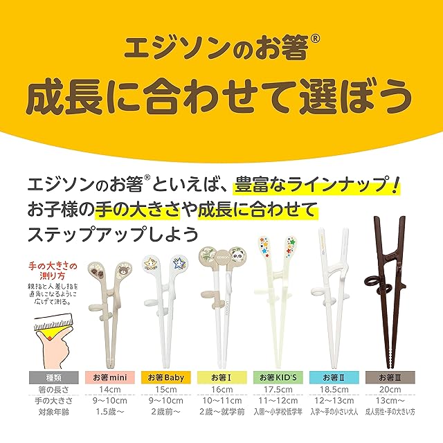 対象月年齢:入学〜手の小さい大人。材質(お箸本体):ABS樹脂(耐熱温度:90℃)、リング:シリコーンゴム(耐熱温度:170℃)。サイズ/重量(お箸):50×35×185mm/19g、リング内径:14mm。生産国:韓国。