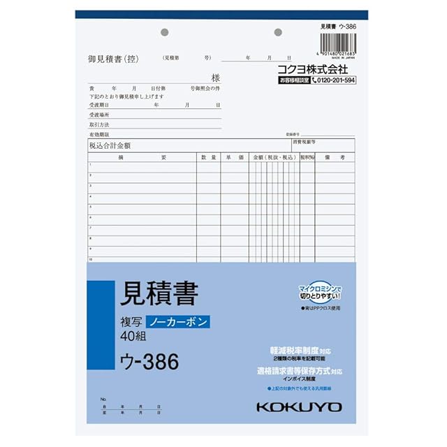 商品名:コクヨ(KOKUYO) 見積書 複写簿 ノーカーボン A4 タテ 22行 40組 ウ-386