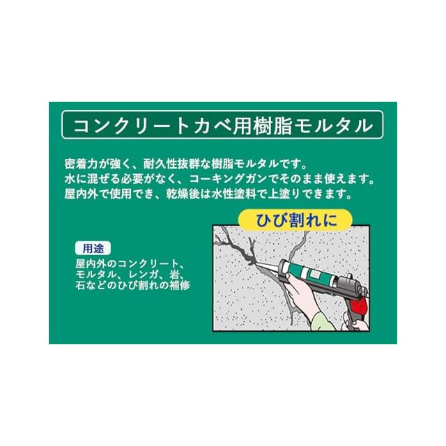 用途:屋内外のコンクリート・モルタル・レンガ・岩石などのひび割れ(9mm幅、9mm深さ以下)補修に。※床面には使用しないでください。※絶えず水がかかったり水につかるところや、いつも湿っているところには適しません。