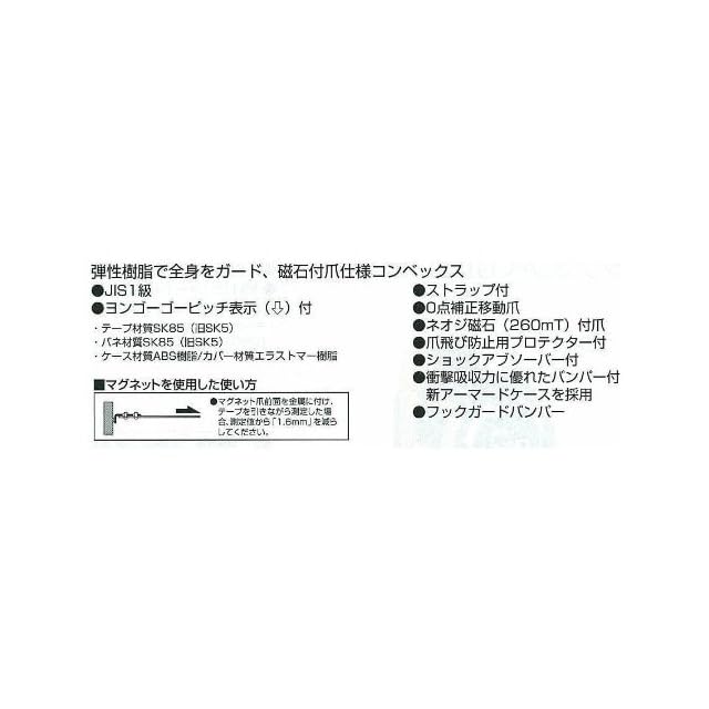 テープ材質 SK85(旧 SK5)、バネ材質 SK85(旧 SK5)、ケース材質 ABS 樹脂/カバー材質エラストマー樹脂