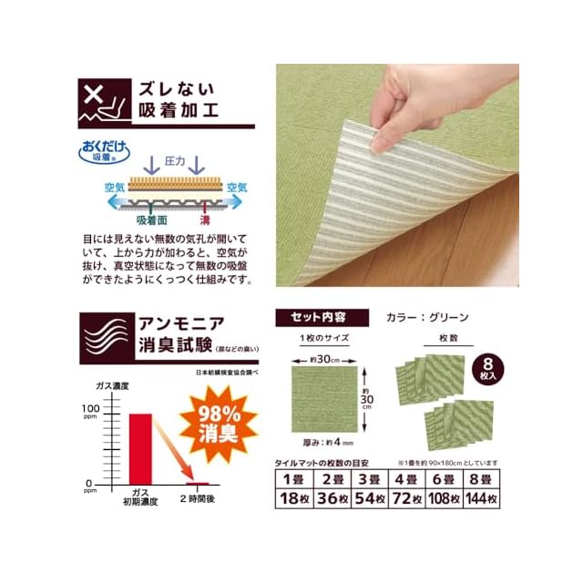 商品名:サンコー おくだけ吸着 獣医師推奨 ペット用撥水タイルマット 30cm×30cm 8枚入 グリーン 犬 猫 サンコー カーペット 【日本製 撥水 消臭 洗える ハサミでカット可】 KH-51
