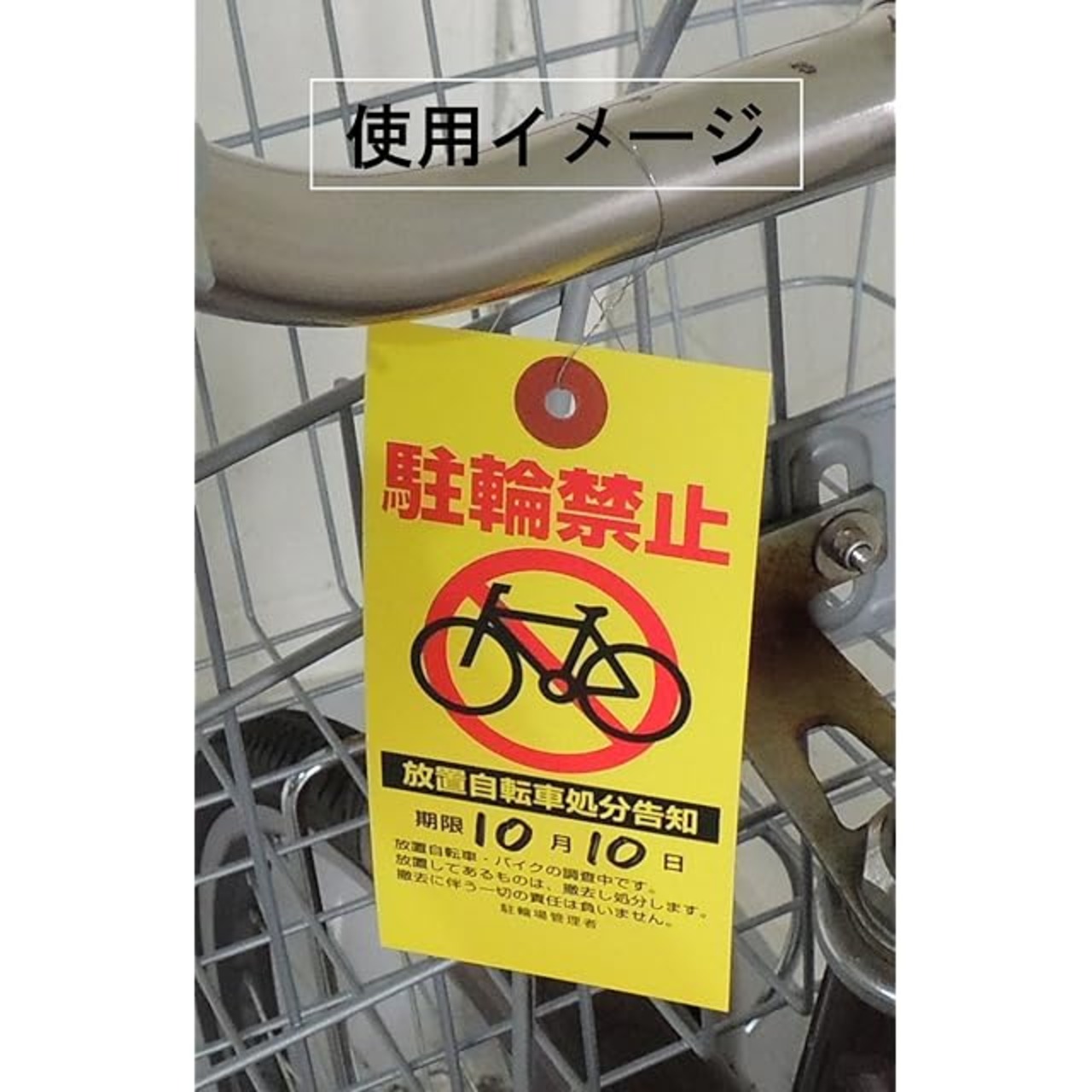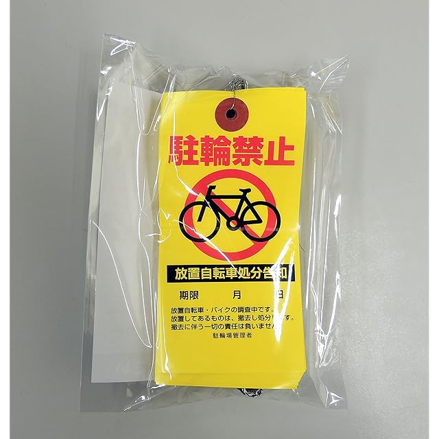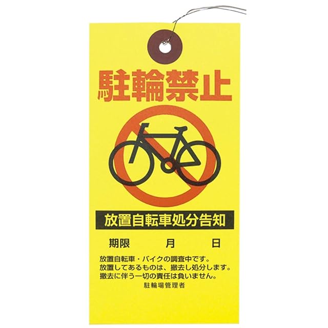 【用 途】 放置自転車への警告・撤去に<br><br> 【特 徴】 ①はっきり目立つ大きさとカラーで抑止効果が期待できます。<br> ②錆びにくいステンレス製の針金付き<br> <br> 【サイズ】 タテ120mm × ヨコ60mm<br> ステンレス針金:先端から穴の中心まで約120mm(全長約240mm)<br><br> 【印 刷】 黄色・赤・黒(片面)<br><br> 【素 材】 紙(黄色)・ステンレス針金<br><br> 【包 装】 50枚毎にOPP袋封入<br><br> 【ご注意】 雨などの水に濡れに対する耐久性はありません。<br> 屋外で雨が予想される場合は、防水タイプをご使用ください。<br> ご使用状況により、紫外線・風雨等による劣化、色褪せが起こります。<br> ご使用時・保管時には、安全面に配慮し、必ず「使用上のご注意」をよくお読みください。<br><br> <b>ご記入時のご注意</b><br> 日付等を記入される場合は、「油性黒マジック」をお奨め致します。<br> 通常のゴム印使用も可能です。<br><br> <b>作業(取り付け・取り外し)時のご注意</b><br> 針金にご注意ください<br> 作業者・自転車等使用者・通行者(幼児・ペットを含む)等の安全に十分に配慮して下さい。<br><br> <b>保管上のご注意</b><br> 幼児の手の届かない場所で保管して下さい。<br> 直射光や極端な高温多湿を避けて下さい。<br> 水分や薬品などが付かないように保管して下さい。<br>