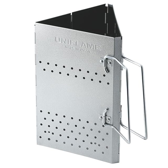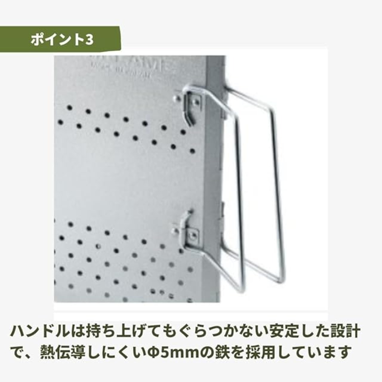<b>[商品スペック]</b><br>●サイズ :<br> 使用時:約19×24.5(ハンドル含む)×28(高さ)cm<br> 収納時:約28×19×3(厚さ)cm<br>●材質 :<br> 炉:ステンレス鋼<br> ハンドル・底網:鉄・クロームメッキ<br>●重量 : 約1.2kg<br><b>[商品詳細]</b><br>炭を入れて、火のついた着火材の上に約10分置くだけ。<br><br>【燃焼システム】<br>チャコスタII内部の炎により上昇気流が発生。<br>その力により本体横孔から空気(酸素)を取り入れ、簡単に炭火を熾せます。<br><br>【薪の火熾しにも】<br>薪も入れられる大きさと強度を持っています。<br>湿った薪でも完全燃焼させることができます。<br><br>【ハンドル】<br>ハンドルは持ち上げてもぐらつかない安定した設計で、熱伝導しにくいΦ5mmの鉄を採用しています。<br><br>【炭は70%程度に】<br>空気の流れを確保するため、炭の入れすぎに注意してください。<br><br>【火熾し量】<br>一度に約1kgの炭を熾せます。