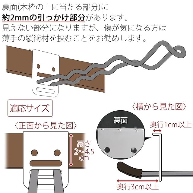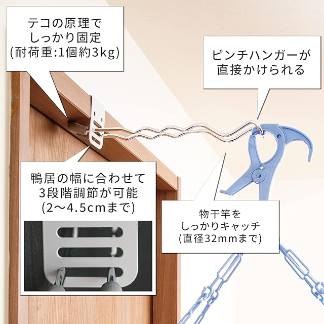 鴨居の幅に合わせて2~4.5cmまで3段階調節が可能。【耐荷重】6kg/2個 ※(耐荷重:1個約3kg)