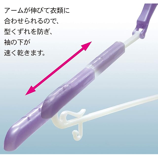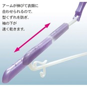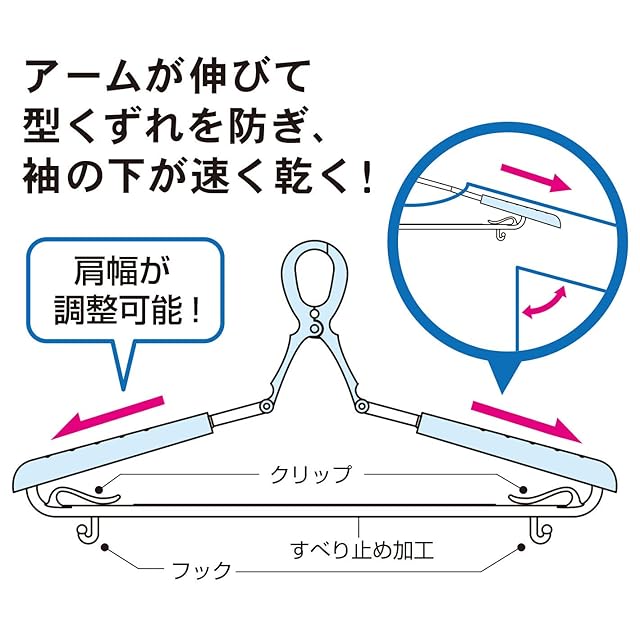 【立体的にきれいに干せるスライドハンガー】肩の部分を立体的に干せる取り外しも可能なパット付きスライド式ハンガーです。衣類に合わせてのびるため、型崩れを防ぎきれいに干せて、乾きが早いのが特長です。
