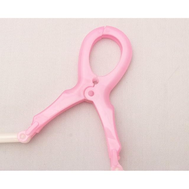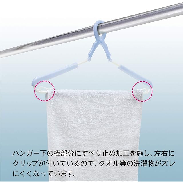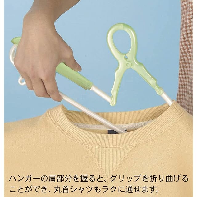 【細部までこだわりました】グリップ部分は曲げられるので、丸首シャツにもスッと入れられます。また、ハンガー下のバーの左右にタオルなどの洗濯物が止められるクリップや、スカートやタンクトップのヒモを掛けるフックも付いています。