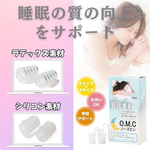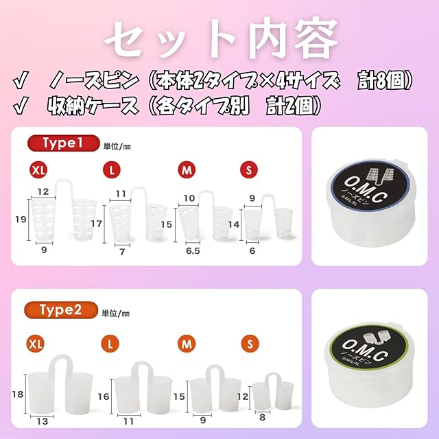 商品名:O.M.C TOKYO ノーズピン 鼻詰まり解消 鼻腔拡張 いびき軽減 鼻呼吸 睡眠時 無呼吸症候群 シリコン素材 8個セット (S/M/L/XL各サイズ×2種類)