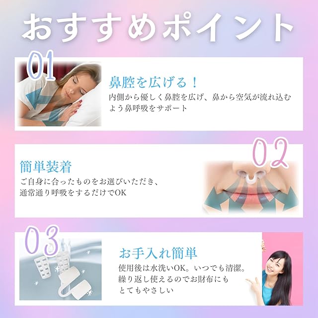 【使い方は簡単】鼻に差し込むだけで、ワンステップ簡単装着♪動いても外れにくいノーズブロックつきになっています。 鼻づまり 、睡眠時、 ジョギング やスポーツに様々なシーンでお使い頂けます。ノーズピン本体は水洗いOKなので、いつでも清潔で繰り返し使用できるので、お財布にもとてもやさしいです。