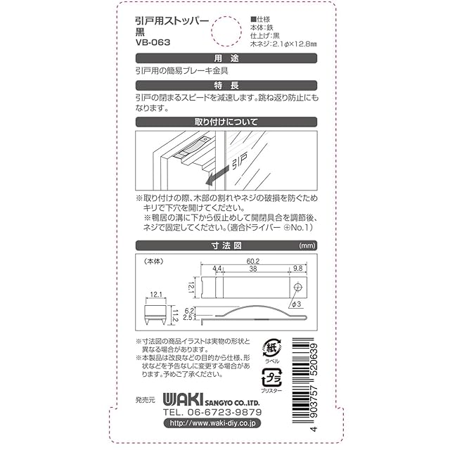 商品名:和気産業(Waki Sangyo) 引戸用ストッパー 引き戸 ゆっくり閉まる ソフトクローズ 跳ね返り防止 黒 60.2mm VB-063