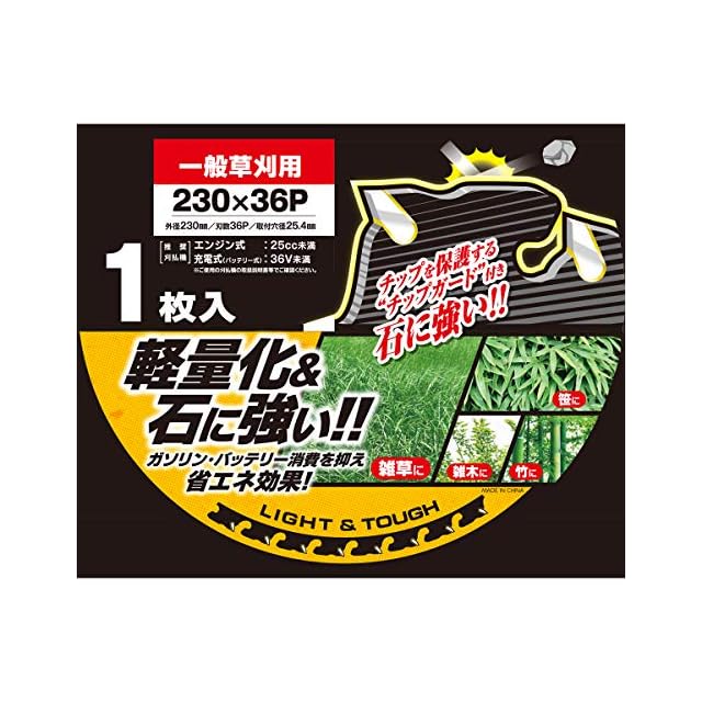 <一般草刈用スタンダード品> ◎雑草 ○笹 △雑木・竹 外径230mm 刃数36P 取付穴径25.4mm 推奨刈払機(草刈機) エンジン式:25cc未満、充電式(バッテリー式):36V未満 ※ご使用の草刈機の取り取扱説明書でご確認ください。
