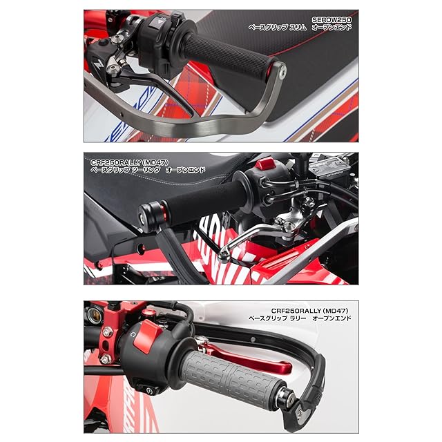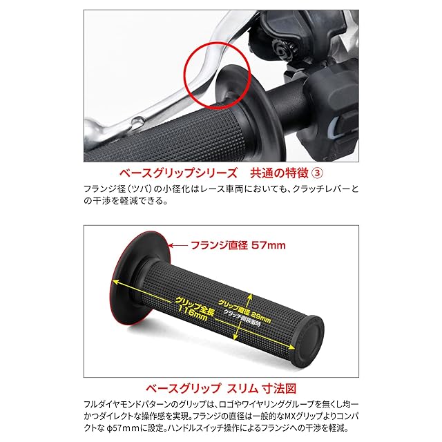 親指が接するツバの直径を、一般的なMXグリップよりコンパクトな57mmとする事で、レーサーではクラッチレバーの干渉を軽減。また、トレール車では親指の保護とハンドルスイッチの操作性を両立。