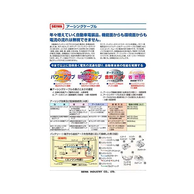 安心・安全な日本製になります。<br>電線の太さは、3種類ご用意しております。<br><br>8sq 許容電流:66A【用途:ヘッドライト、オーディオ】<br>15sq 許容電流:92A【用途:エンジン周辺】<br>20sq 許容電流:121A【用途:エンジン周辺】<br><br>セイワのアーシングケーブルは、非常に電気抵抗の少ない伝導率の良い<br>銅に特殊鍚メッキを施し、熱に強い透明ビニールでシース(被覆)され、<br>圧着端子は 無酸素銅に特殊鍚メッキを施した高性能でハイパワーの<br>アーシングケーブルです。