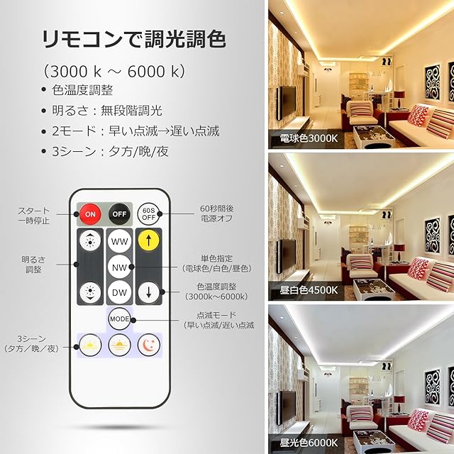 【リモコンで調光調色】幅広く細やかな色温度3000k~6500kまで調整が行えます。完全な白はもちろん、 白よりの電球色や微妙な昼白色、昼光色、温白色も鮮明に実現可能!(ご注意:初使用時、リモコンの絶縁シートを取り外して操作してください。)
