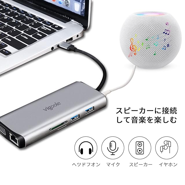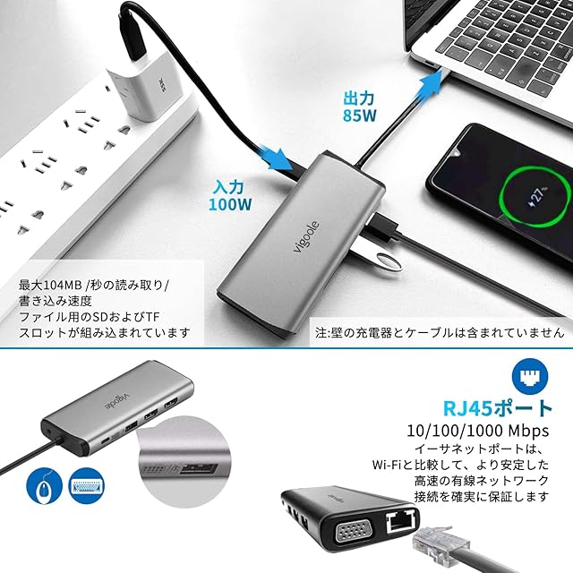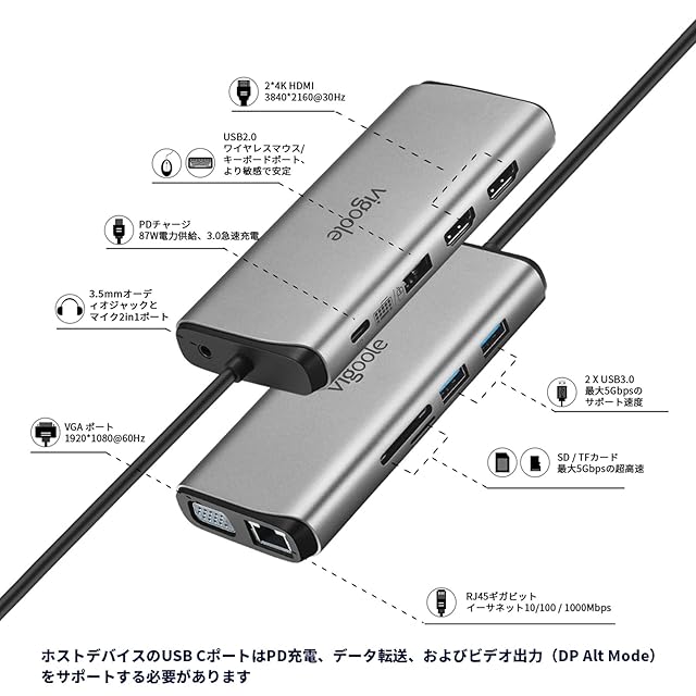 <p><b>製品仕様 :</b> <br> <b>製品名:VIGOOLE USB Cハブ11 in 1高速 USB Type Cハブ</b><br> インターフェイスタイプ:USB3.0X2 高速データ伝送<br> 100W PD充電急速充電<br> 4K HDMI X 2<br> VGAポート<br> ワイヤレスマウス/キーボード用のUSB2.0X1ポート<br> SDカードスロット×1<br> マイクロSD(TF)カードスロット×1<br> 3.5mmオーディオポート<br> イーサネット/ RJ-45ポート<br> アイテム寸法:135 * 63 * 28mm <br> 材質:アルミ合金<br> ケーブル長:30mm <br> カラー:グレー<br></p> <b>特徴:</b> <br> 1. トリプルディスプレイが接続されたVIGOOLEUSB Cハブ:HDMIおよびVGA出力のデュアルディスプレイ<br> 2. 87W PD急速充電<br> 3. 2 * 5Gbpsのデータ転送速度を備えたUSB3.0ポートであり、USBデバイスを充電するためのBC1.2急速充電プロトコルにも準拠しています <br> 4. プラグアンドプレイとホットスワップをサポート; <br> 5. 1つのUSB2.0ポートは、ワイヤレスマウス/キーボードに最適です。ワイヤレス接続へのUSB 3.0無線周波数干渉により、感度と安定性が向上します。<br> 6. 様々な機種との互換性<br> <b>USB Cポートを備えたデバイス:</b> <br> MacBook Pro(2016、2017、2018)、Dell XPS、Dell、ASUSラップトップ、HUAWEI MateBook、HP Spectre Notebook、ThinkPad、<br>HUAWEI P20 / 30、LG G5、HTC10など。Windowsでの作業 7/8/8。 1/10、Mac OS X 10. 6、Linux 2. 6. 14以降のオペレーティングシステム(注:ラップトップと電話のUSB CポートはDP(ビデオ)出力をサポートする必要があります)。<br> <b>パッケージは以下を含みます: </b> <br> 1 x VIGOOLE USB C ハブ 11-in-1 USB Type C ハブ<br> <br>
