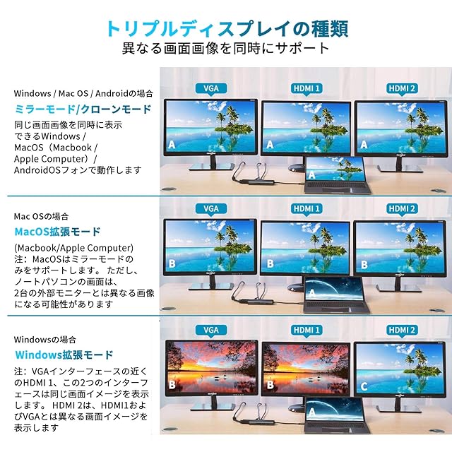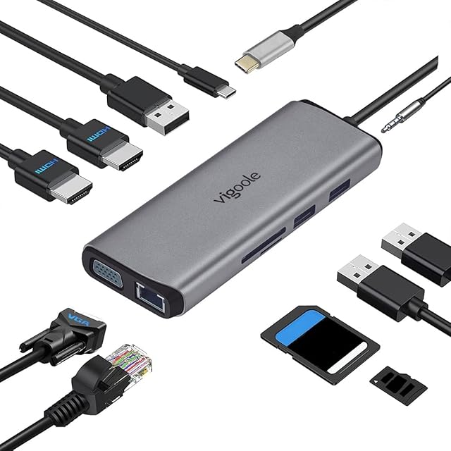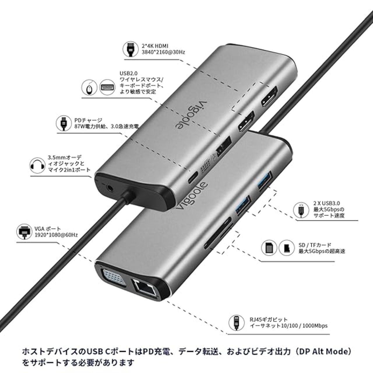 商品名:vigoole USB C ハブ 11-in-1 トリプルディスプレイUSB Type C ハブHDMI ドッキングステーション 変換アダプタ2(デュアル)HDMI 4K HDMI, 1080P VGAポート, PD 100W 急速充電ポート, 1Gbps イーサネット,3つの USB ポート,MicroSD & TFカード スロット搭載MacBook USB C デバイス等対応