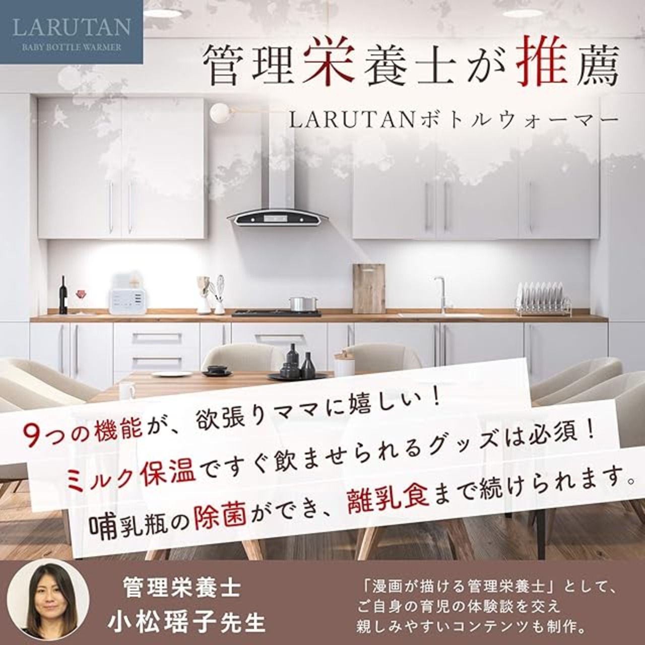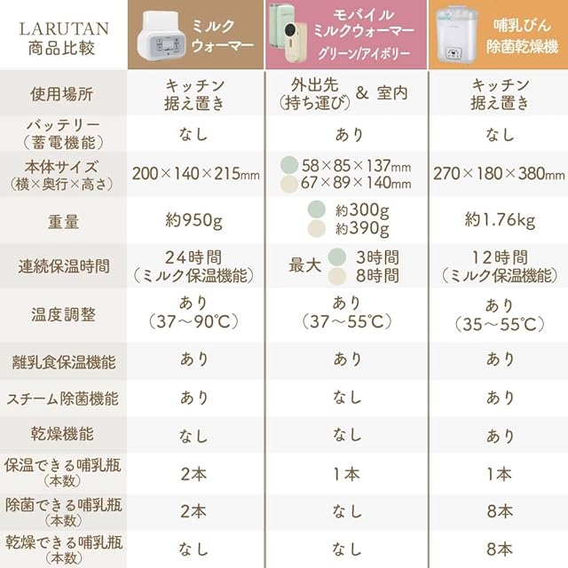 1台9機能】 多彩な9機能で、他社商品と比較して圧倒的に高機能です。 ミルク保温・スチーム除菌・離乳食保温・急速解凍・急速加熱・タッチパネル・空焚き防止・自動停止・夜間も見やすいバックライト 【ひと目でわかるクイックスタートガイド】 ・到着してすぐ使えるようにクイックスタートガイドが付属しています。お急ぎの場合はクイックスタートガイド、詳細は必ず説明書をご確認ください。 【育児の最強アシスタント!】 ・LARUTANボトルウォーマーなら赤ちゃんが泣いてすぐにミルクをあげられます。ママとパパのストレスも軽減。 【授乳上手は寝不足知らず】 ・夜間に熱湯を沸かしたり、注いだりしなくて良いので安全です。タッチパネル、夜間も見やすいバックライトで簡単操作。 【大切なお子様に、機能重視の多機能ボトルウォーマーを】[本体サイズ]:幅約20cmx奥行き約13.5cmx高さ約13.5cm(カバー収納時)~約21.5cm(使用時) / 重量 約0.95kg [仕様] 100V ※日本国内でしか使用できません。日本国内利用のために作られた製品です 【付属品】クイックスタートガイド(1枚) / 説明書(冊子) / LARUTANボトルウォーマー本体 PSE認証(経済産業省届出済) ミルクは長時間の保温は衛生上おすすめしておりません。哺乳瓶は2本まで入ります。200ml~など大きめの哺乳瓶の場合は上蓋の天井が空いてフレキシブルに収納できるデザインです。・【ボトルウォーマー内部のお手入れ方法】クエン酸、または少量の中性洗剤を利用してやさしくタオルなどで汚れを拭き取り、きれいな水で数回しっかりとすすいでください。(電源ケーブル及び本体外部が濡れないようにして下さい)