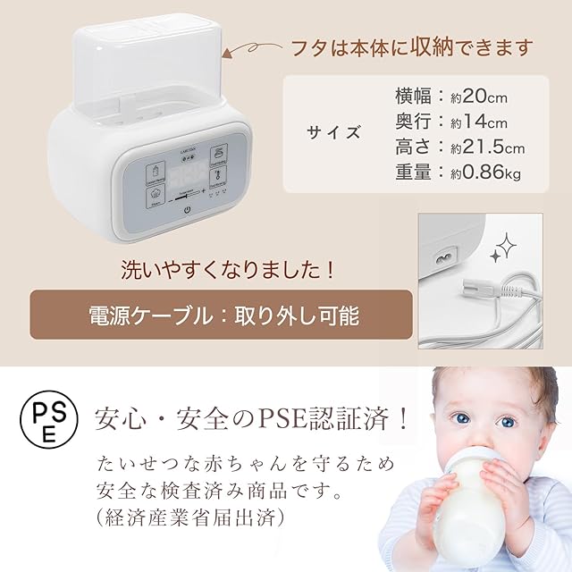 【大切なお子様に、機能重視の多機能ボトルウォーマーを】[本体サイズ]:幅約20cmx奥行き約14.0cmx高さ約14.5cm(カバー収納時)~約21.5cm(使用時) / 重量 約0.86kg [仕様] 100V ※日本国内でしか使用できません。日本国内利用のために作られた製品です 【付属品】クイックスタートガイド(1枚) / 説明書(冊子) / LARUTANボトルウォーマー本体 PSE認証(経済産業省届出済)