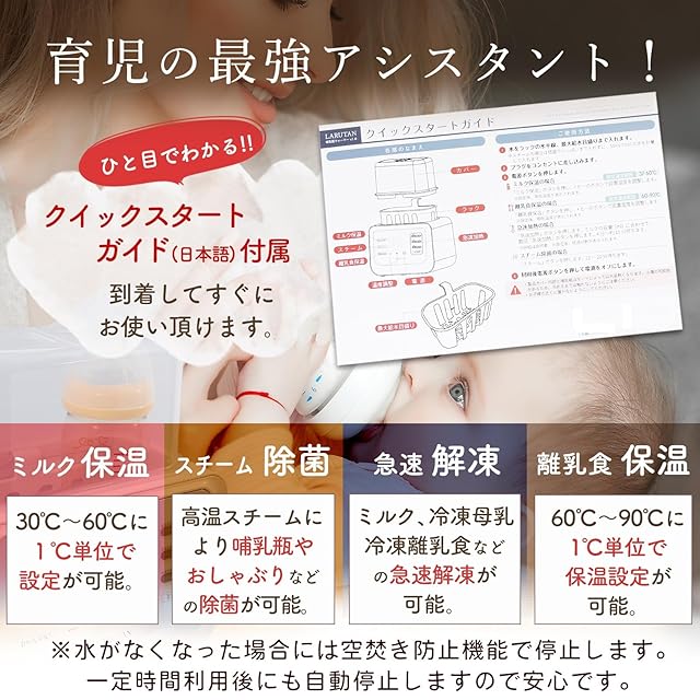 【育児の最強アシスタント!】 ・LARUTANボトルウォーマーなら赤ちゃんが泣いてすぐにミルクをあげられます。ママとパパのストレスも軽減。 【授乳上手は寝不足知らず】 ・夜間に熱湯を沸かしたり、注いだりしなくて良いので安全です。タッチパネル、夜間も見やすいバックライトで簡単操作。