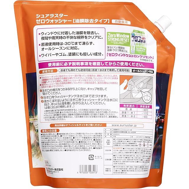 SurLuster(シュアラスター) ゼロウォッシャー[油膜除去タイプ]自動車用フロントガラス・窓ガラスの洗浄 油膜 ウォッシャー液 中性 2000ml オールシーズン対応 -30℃まで対応 S-141