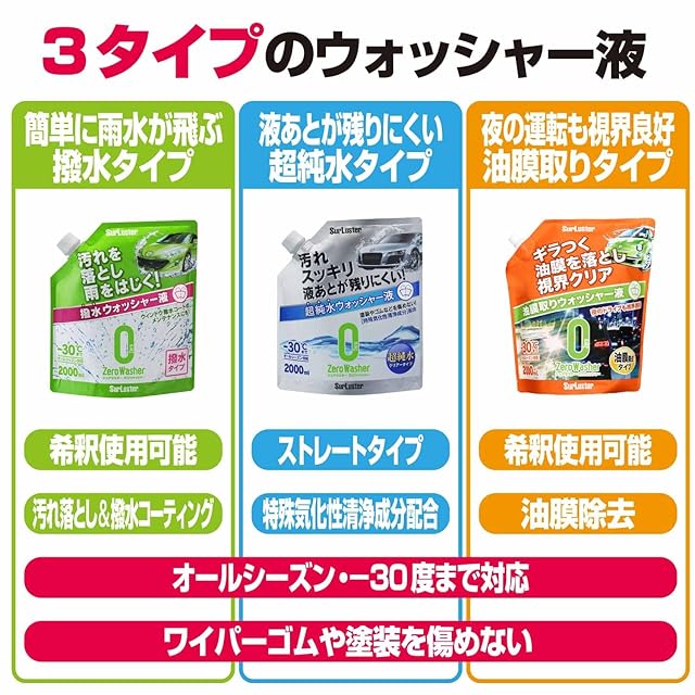 商品名:SurLuster(シュアラスター) ゼロウォッシャー[油膜除去タイプ]自動車用フロントガラス・窓ガラスの洗浄 油膜 ウォッシャー液 中性 2000ml オールシーズン対応 -30℃まで対応 S-141