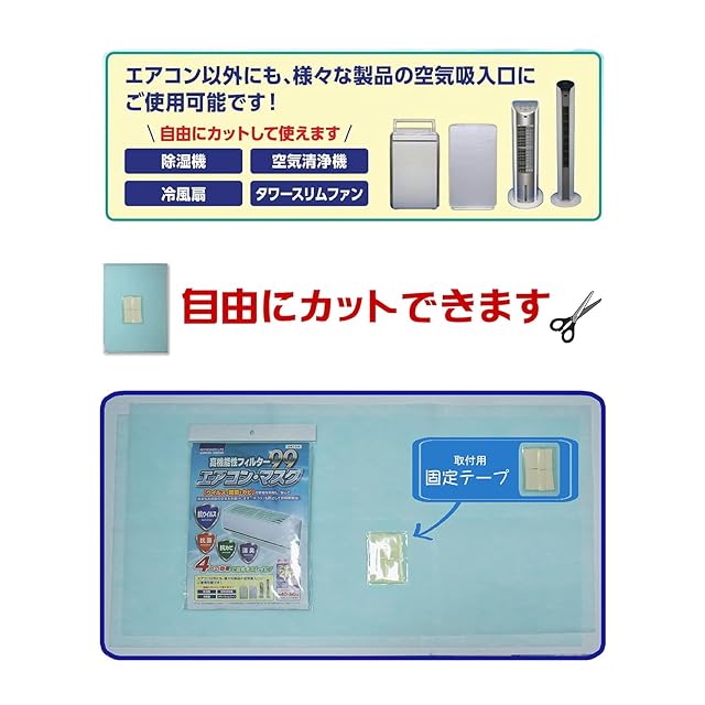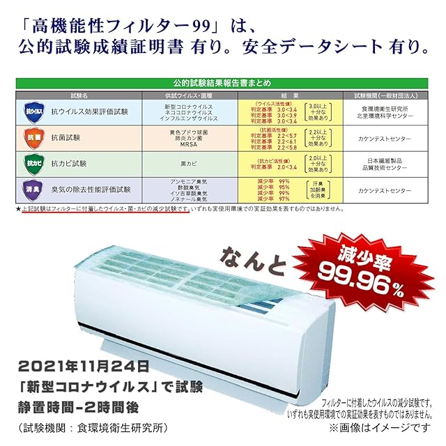 ■高機能性フィルター99 エアコン・マスク<br> ・エアコン用 フリーサイズ約40×80㎝<br>・抗ウイルス・抗菌・効カビ・消臭の公的試験機関の効果評価試験のエビデンスを担保しています。<br>・「ウイルス・雑菌・カビ」の繁殖を抑制し、安心で清潔なお部屋の空気をお届けします。 「ホコリ」も防止してお掃除軽減!<br>・抗ウイルス・抗菌・効カビ・消臭の高機能性フィルターはお部屋の空気をクリーンで爽やかに!<br>・エアコン以外にも、様々な製品の空気吸入口にご使用可能です。<br>・吸入口の横幅が80cmを超える機種や、上面と前面の吸入口の合計サイズが40cmを超える機種には適応しません。<br>・吸入口が可動式の機種などには取付けできません。<br>・フィルターを2枚以上重ねて使用しないでください。<br>・固定テープを貼る時は、貼る場所の汚れを取り除き、よく乾燥させてください。<br>・フィルターが目詰まりした状態でご使用を続けると、エアコンの性能に影響を与える恐れがありますので、フィルターが汚れたら早めにお取替えください。<br>・フィルターの交換目安は、部屋の建築構造および環境によって異なりますが、一般のご家庭では30~45日が使用期間の目安です。<br>・用途以外に使用しないでください。<br>・使用後は、プラスチックごみとして各地方自治体の定める方法に従って廃棄してください。<br>・ご覧頂いている商品の写真につきましては、できるだけ実物の色に近くなるように努めておりますが、お使いの環境(モニター、ブラウザ等)の違いにより、色の見え方が実物と若干異なる場合がございます。ご了承くださいませ。