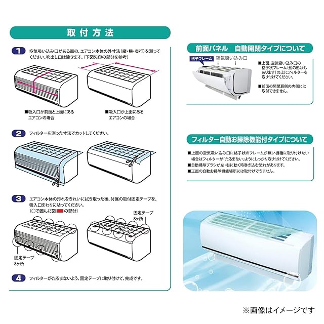 ※フィルター自動お掃除機能付タイプについて / 上面の空気吸い込み口に格子状のフレームがない機種に取り付けたい場合は、フィルターが「たるまない」ようにしっかり取り付けてください。自動掃除ブラシが左・右に動く時巻き込む恐れがあります。また、正面のお掃除機能場所には取付けできません。