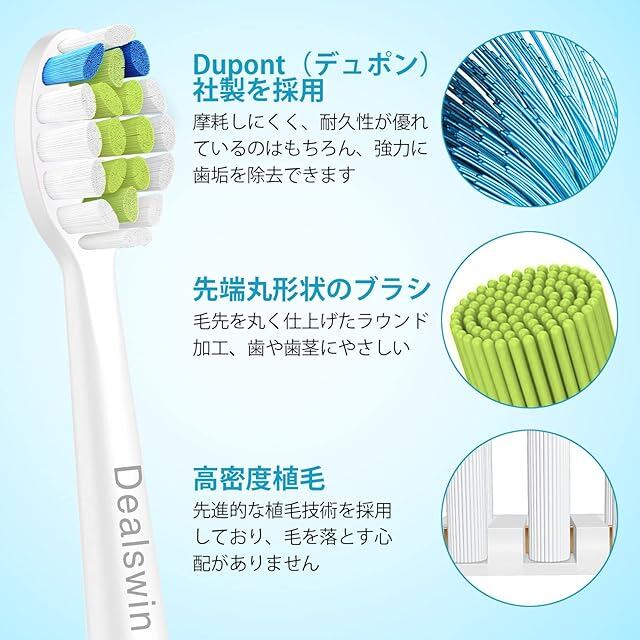ご注意:Dealswinはインディーブランドです。当商品はDealswinが製造するものです。DuPont(デュポン)社製を採用 フィリップス・ソニッケアー用のDealswin替えブラシは、70年以上にわたりオーラルケア合成繊維業界にて品質の頂点を極めていることで認知されているデュポン製を使用しております。歯の表面をきれいにするだけでなく、歯間もきれいにます。 先端丸形状のブラシ毛 毛の先端が丸形になったブラシで、歯茎を傷つけることなく快適にブラッシングすることができます。 ひし形カットの高密度ブラシ毛 高密度に植毛されたひし型毛先のブラシが歯と歯ぐきを効果的に磨き上げます。 歯の表面を保護 最適な歯のクリーニングと歯茎の健康状態を維持し・改善のために設計されています。 保護カバー付き 各交換ヘッドには、衛生的に保つためにカバーが付いています。保管や持ち運びに非常に便利です。旅行中にブラシ毛が押しつぶされるのを避けることができますし、ブラシ毛の形を維持する。ほこりや細菌の侵害を免れることもできます。 ブラシが交換時期をお知らせ 青色のブラシ毛が白くなった交換のサイン。常に最高のブラッシング効果を実感していただくため、ブラシは3か月ごとに交換をオススメいたします。