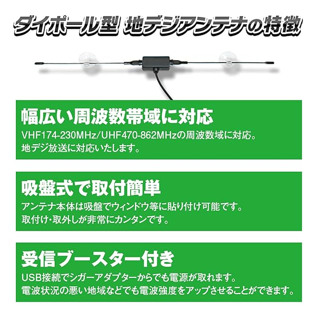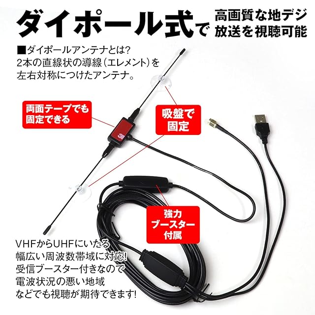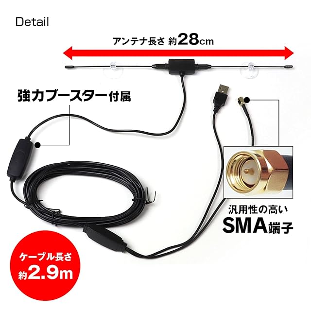 【受信ブースター付き】 電波状況の悪い地域などでも電波強度をアップさせることが可能。 電源端子がUSBタイプなので、シガーアダプターなどから電源取得が可能。
