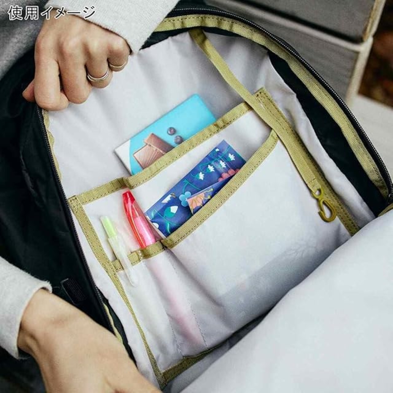 【雨の日でも安心】撥水加工を施した生地を使用し、なおかつジッパーフラップで雨の侵入を防ぎます。