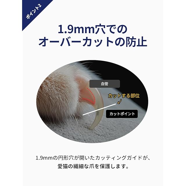 【1.9mmの穴で正確にカット】 猫の爪のお手入れには、正確さが何よりも大切です。ペスルームの爪切りは、ギロチンタイプの1.9mmの穴で、丸い爪にも尖った爪にも対応できるユニークなデザインです。従来のバリカンでは、カットが不正確で、不必要な苦痛を与えてしまうことがよくありました。ペスルームの革新的なデザインなら、爪の尖った部分だけをレーザーで確実にカットし、ペットの快適性を最大限に高めます。爪切りを面倒な作業からシームレスな日課に変えましょう。