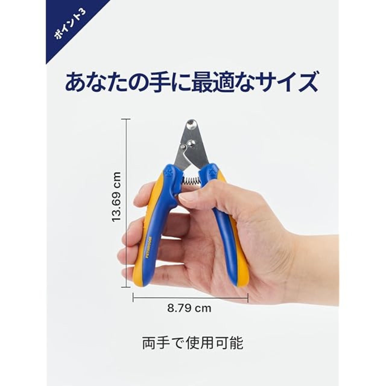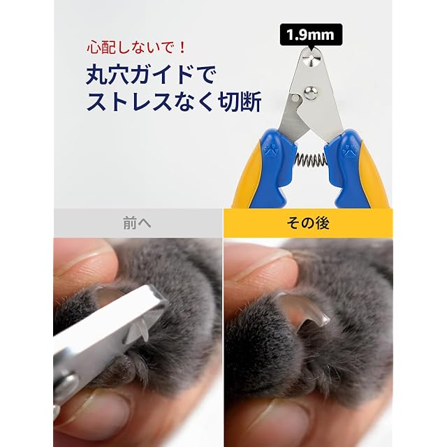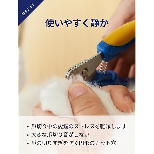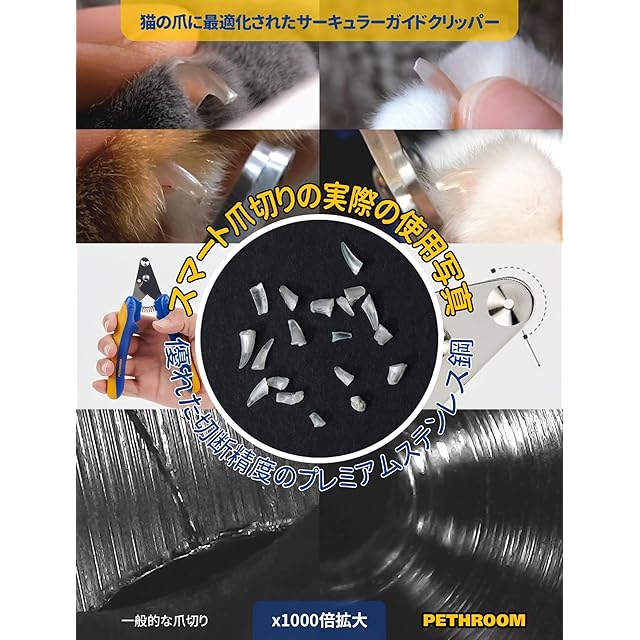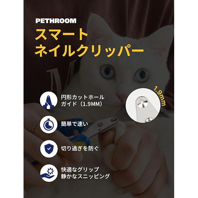 <b>Pethroom スマート爪切り 猫: 変幻自在の猫の爪ケア</b><br> <br> ネコの友だちのケアは、単に餌を与えたり遊んだりするだけではありません。猫の爪の状態は、猫の健康、快適さ、幸福感に大きく影響します。ペスルームの猫用スマート爪切りは、猫にとっても飼い主にとっても、比類のない爪切り体験を提供するために設計された画期的なツールです。<br> <br> <b>圧倒的な精度</b><br> 不安でいっぱいの爪切りの日々はもう終わりです。ペスルームの爪切りは最先端のギロチン設計で、毎回安定した正確なカットを実現します。この設計により、誤って切りすぎて愛猫が痛がったり、怪我をしたりするリスクと積極的に闘っています。ペットの健康を第一に考えたクリップです。<br> <br> <b>猫に合わせたデザイン</b><br> 猫にはそれぞれ個性がありますが、従来のバリカンは画一的なものでした。ペスルームのバリカンは違います。1.9mmのギロチンタイプの穴は、丸い爪にも尖った爪にも完璧に対応するように作られています。この精密さにより、爪の尖った端だけを確実に切り取ることができ、大切なペットの苦痛や不快感を取り除くことができます。<br> <br> <b>優れた耐久性</b><br> 情熱と精度をもって作られたペスルームの爪切りは、高級ステンレス鋼で作られています。この素材の選択により、切れ味が持続し、各カットがスムーズできれいで、爪が砕けたり折れたりする危険性がないことをします。当社のバリカンへの投資は、永続的な品質と愛猫の長期的な快適性への投資です。<br> <br> <b>ユーザーフレンドリーな使い心地</b><br> 当社のバリカンは、頑丈な高反発スプリングを採用し、適応可能なカット角度と可動域を提供します。そのため、爪切りのプロセス全体にわたってコントロールが可能で、毎回スムーズで手間のかからない作業が行えます。安全性と利便性を兼ね備え、比類のないグルーミング体験をお届けします。<br> <br> <b>安全で快適なグリップ</b><br> 爪切りにおいて、安定したグリップを確保することは非常に重要です。当社のバリカンは、滑りにくく、人間工学に基づいた形状のハンドルを採用。TPE加工が施されているため、しっかりと握ることができ、楽に正確にカットすることができます。切れ味だけでなく、握り心地の良さと自信も大切です。<br> <br> <b>安全性と品質</b><br> ペスルームのこだわりは製品デザインだけではありません。ペスルームのバリカンは自社で開発・製造されており、厳格な品質管理が行われています。認定試験所からの認証と国際的な安全基準の遵守により、当社のバリカンが効果的であるだけでなく、大切なペットにとっても安全であることを信頼していただけます。<br> <br> <b>最適な使用方法</b><br> 1. 猫の前足を優しく押して爪を露出させます。<br> 2. 丸い刃の中に爪を慎重に合わせます。<br> 3. 安全な範囲内で、クイックを避けながら、徐々にお好みの長さに切り取ります。<br> <br> ペスルームは、キャットペアレントや専門家からのフィードバックを取り入れ、爪の手入れで直面する課題を解決するためにスマート爪切りを開発しました。安全性、正確性、使いやすさを最優先に考えたこの爪切りは、ペットのケアを向上させるペスルームのこだわりの証です。