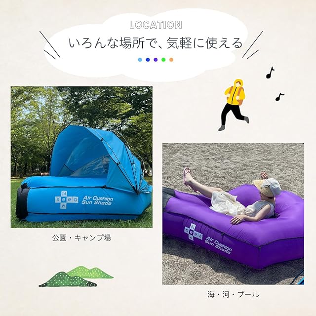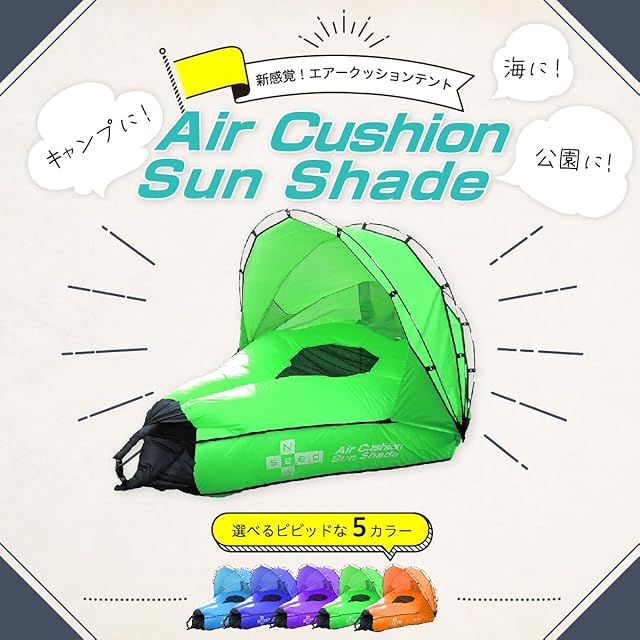 公園、ビーチ、プール、キャンプ場、アウトドアからインドアまで様々な場所で大活躍間違いなしのエアクッションテントです