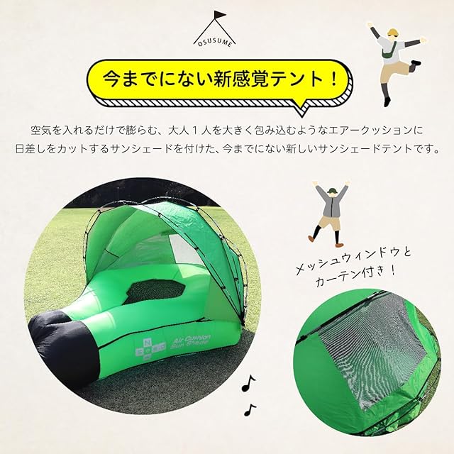 大人1人を大きく包み込むようなエアークッションに、日差しをカットするサンシェードを付けたレジャーテント