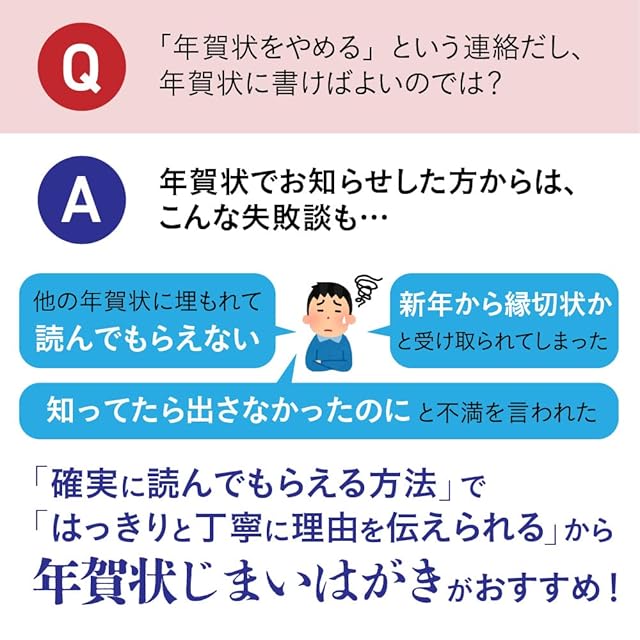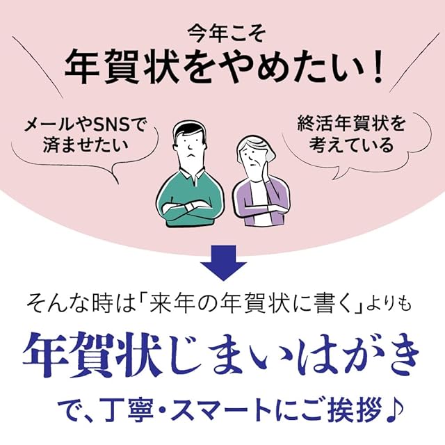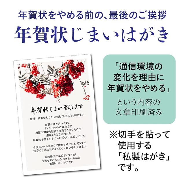年賀状をやめたい方、年賀状じまいはがきで丁寧なご挨拶をして終わりにしましょう。疎遠で年賀状だけのお付き合い、連絡をとっていない、年末は仕事が忙しい、メールなどで連絡できている、年齢のこともあり終活で整理をしたい。ご連絡の挨拶文が印刷してある、文章印刷済みのはがき。(お名前の印刷はございません)切手を貼って投函いただく私製はがき用紙。(ご使用時に切手を貼ってご使用ください)通信環境の変化を理由に年賀状をやめて年賀状は辞めて、今後は年賀状とは別の形でお付き合いを続けていきたい、という内容の文章になります。